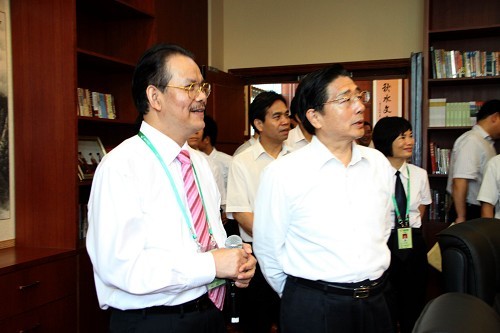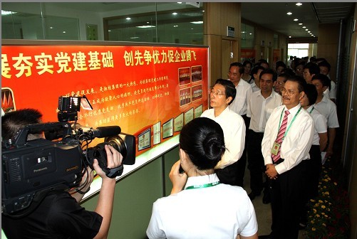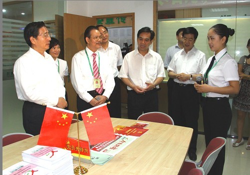 圖為自治區(qū)黨委書記、人大常委會(huì)主任郭聲琨(左一)就湘桂集團(tuán)開展創(chuàng)先爭(zhēng)優(yōu)活動(dòng)到集團(tuán)總部調(diào)研。
