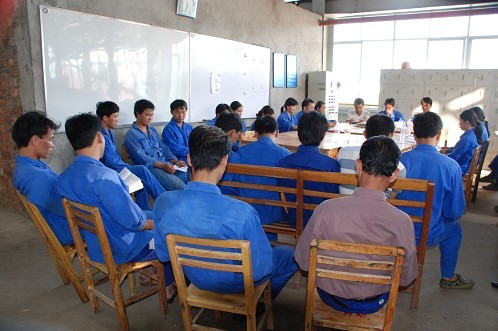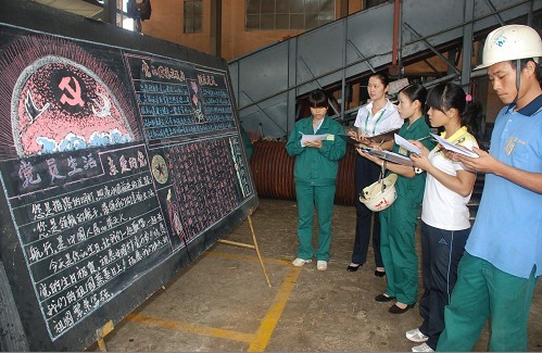圖為車間學(xué)習(xí)開展創(chuàng)先爭(zhēng)優(yōu)活動(dòng)文件精神。